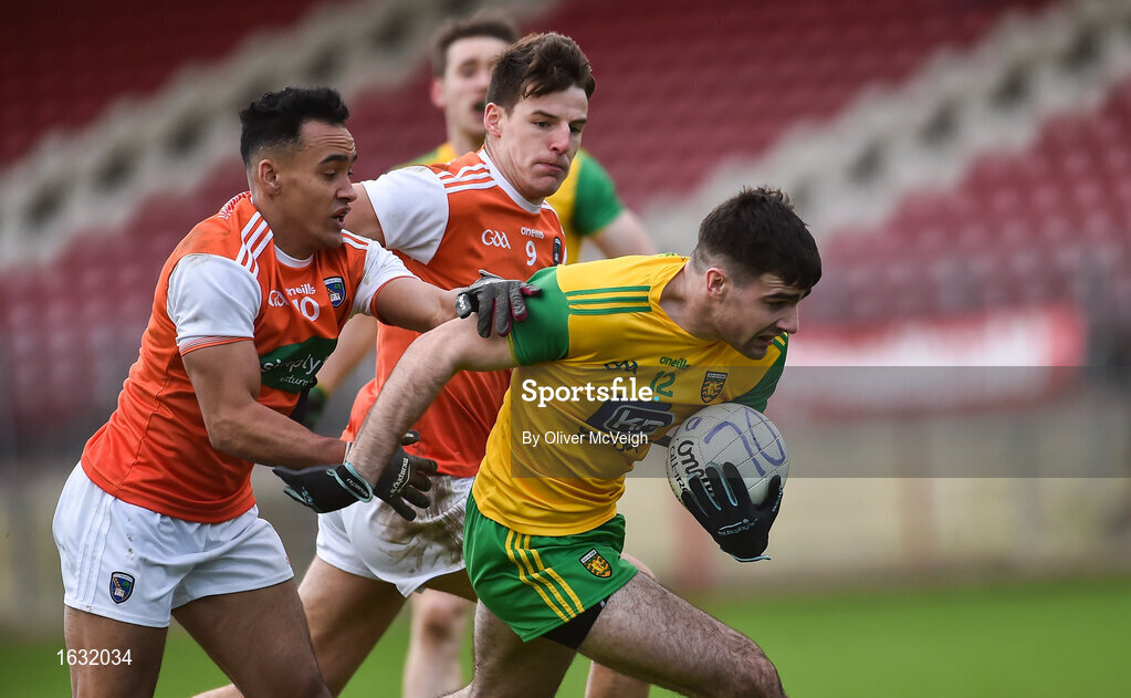 13 January 2019; Caolan McGonigle of Donegal in action against Jemar Hall and Niall Grimley of Armagh during the Bank of Ireland Dr McKenna Cup semi-final match between Donegal and Armagh at Healy Park in Tyrone. Photo by Oliver McVeigh/Sportsfile