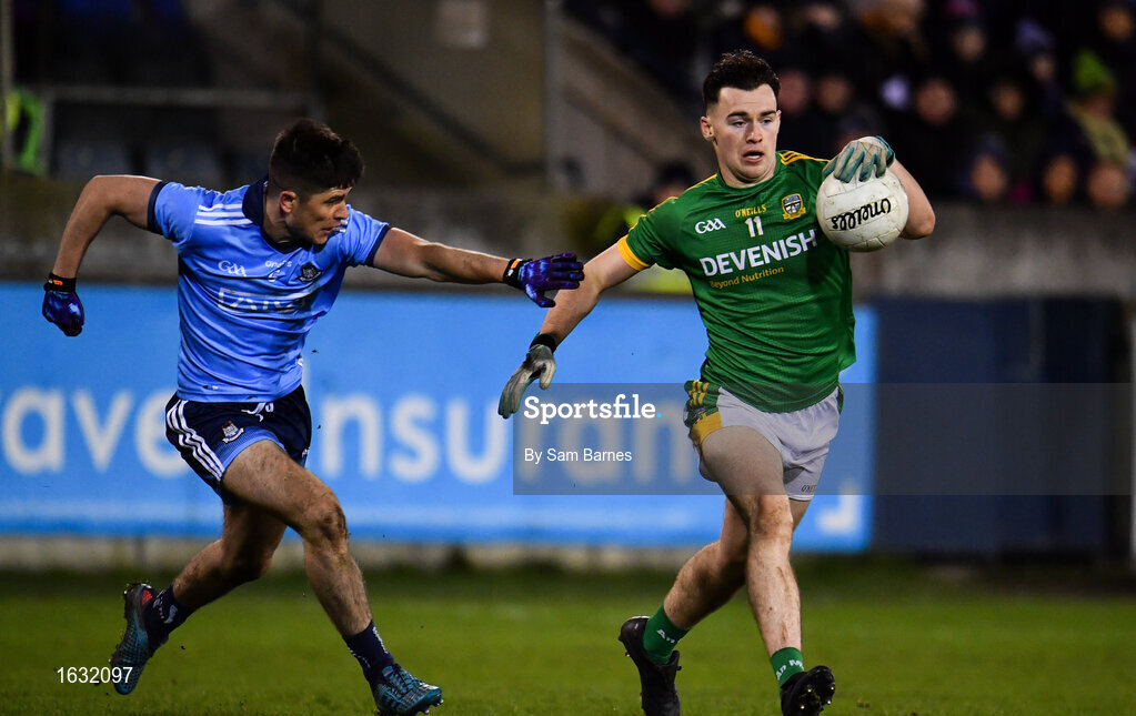12 January 2019; Darragh Campion of Meath in action against Conor Mullally of Dublin during the Bord na Mona O'Byrne Cup semi-final match between Dublin and Meath at Parnell Park in Dublin. Photo by Sam Barnes/Sportsfile