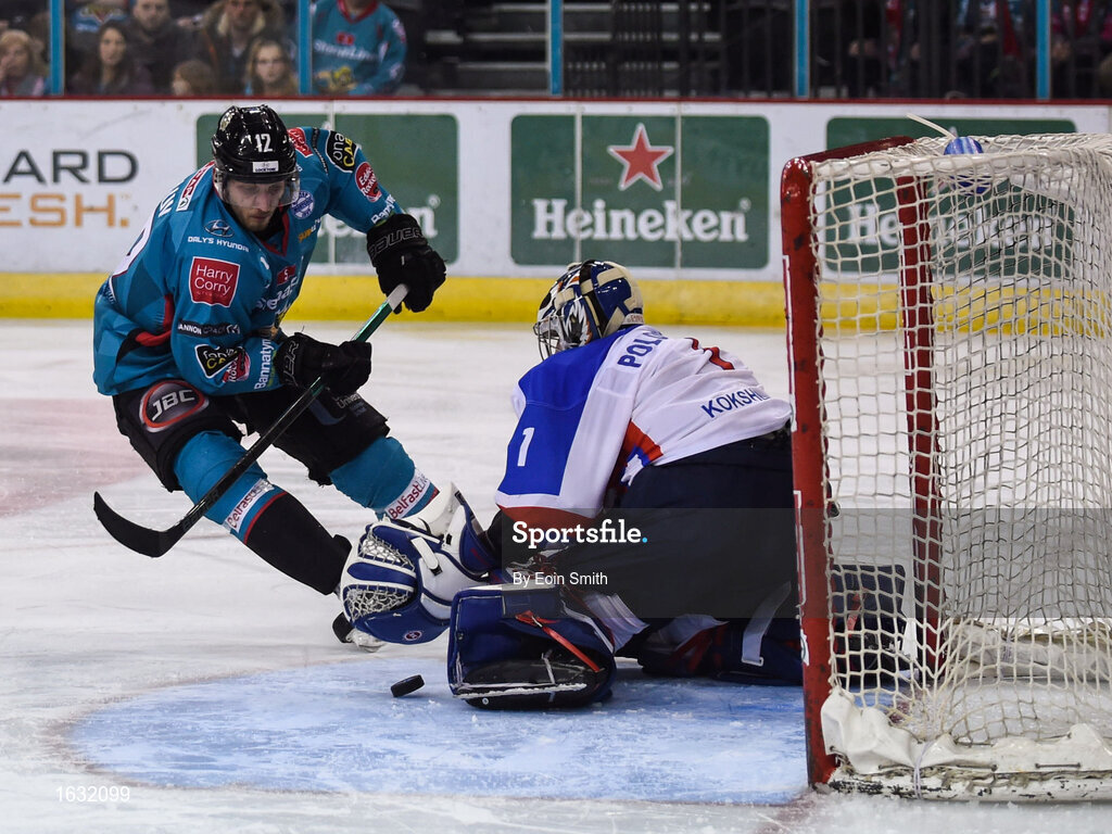 13 January 2019; Kyle Baun of Belfast Giants has his shot saved by Ivan Poloshkov of Arlan Kokshetau during the IIHF Continental Cup Final match between Arlan Kokshetau and Stena Line Belfast Giants at the SSE Arena in Belfast, Co. Antrim. Photo by Eoin Smith/Sportsfile