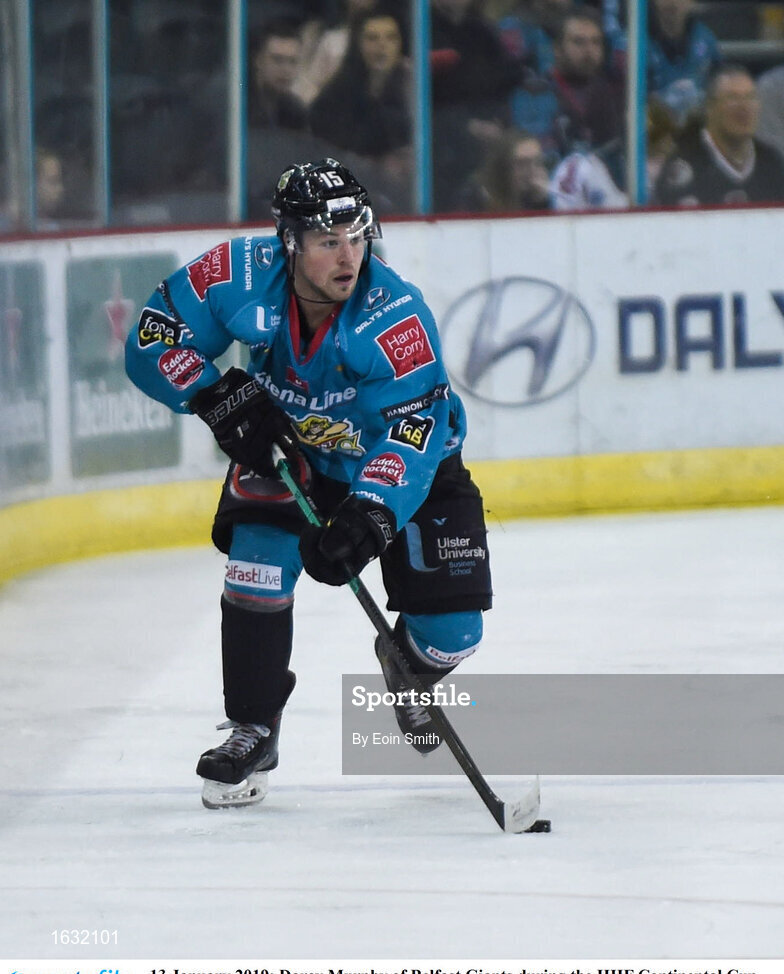 13 January 2019; Darcy Murphy of Belfast Giants during the IIHF Continental Cup Final match between Arlan Kokshetau and Stena Line Belfast Giants at the SSE Arena in Belfast, Co. Antrim. Photo by Eoin Smith/Sportsfile