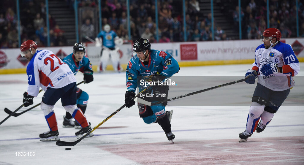 13 January 2019; Josh Roach of Belfast Giants in action against Ivan Kiselev, left, and Vladislav Kolesnikov of Arlan Kokshetau during the IIHF Continental Cup Final match between Arlan Kokshetau and Stena Line Belfast Giants at the SSE Arena in Belfast, Co. Antrim. Photo by Eoin Smith/Sportsfile