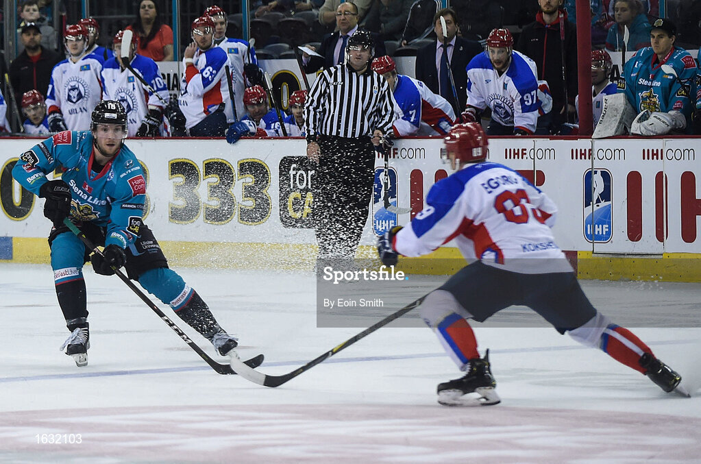 13 January 2019; Curtis Leonard of Belfast Giants in action against Sergey Egorov of Arlan Kokshetau during the IIHF Continental Cup Final match between Arlan Kokshetau and Stena Line Belfast Giants at the SSE Arena in Belfast, Co. Antrim. Photo by Eoin Smith/Sportsfile