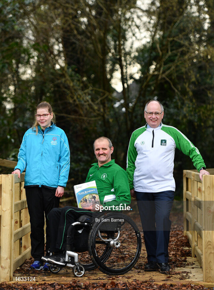 21 January 2019; Edele Armstrong, left, Special Olympic Athlete, Declan Slevin, centre, IWA, and Joe Geraghty, Vision Sport Ireland, during the Great Outdoors - A Guide for Accessibility event at the Sport Ireland National Sports Campus in Dublin. Photo by Sam Barnes/Sportsfile