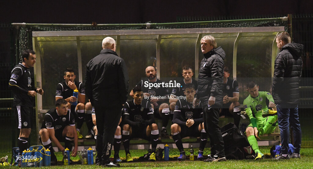 19 January 2019; Finn Harps manager Ollie Horgan speaks to his players at half-time of a pre-season friendly match between Finn Harps and Limerick at the AUL Complex in Clonshaugh, Dublin. Photo by Stephen McCarthy/Sportsfile