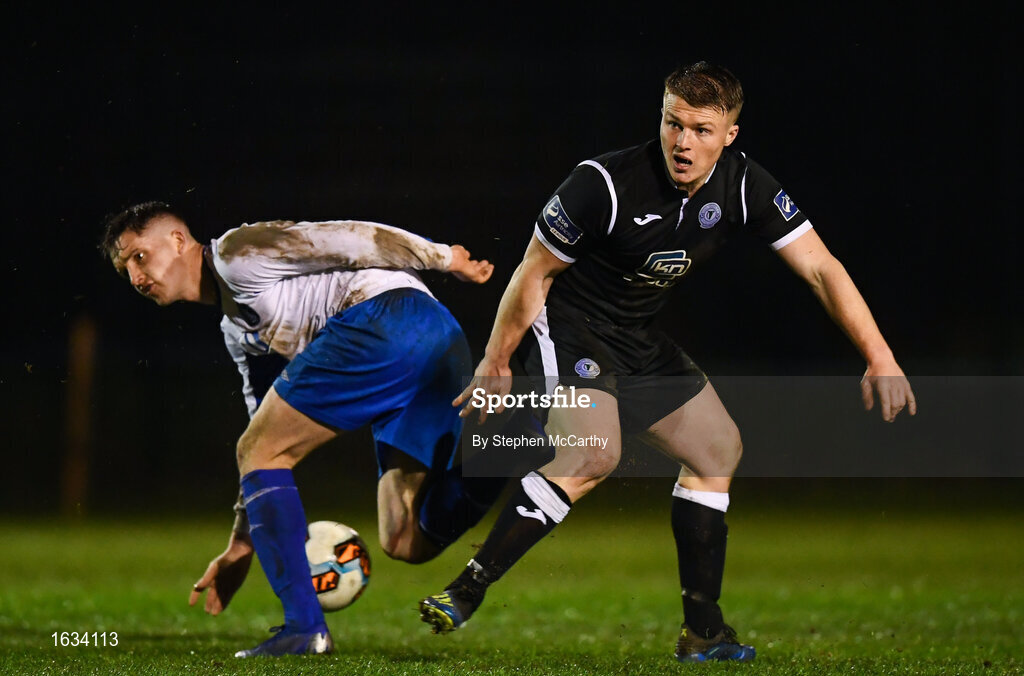 19 January 2019; Daniel O'Reilly of Finn Harps and Seán McSweeney of Limerick during a pre-season friendly match between Finn Harps and Limerick at the AUL Complex in Clonshaugh, Dublin. Photo by Stephen McCarthy/Sportsfile