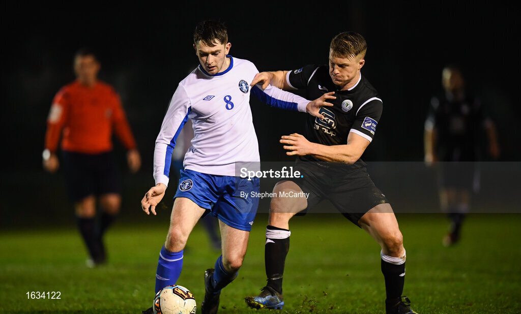19 January 2019; Karl O'Sullivan of Limerick and Daniel O'Reilly of Finn Harps during a pre-season friendly match between Finn Harps and Limerick at the AUL Complex in Clonshaugh, Dublin. Photo by Stephen McCarthy/Sportsfile