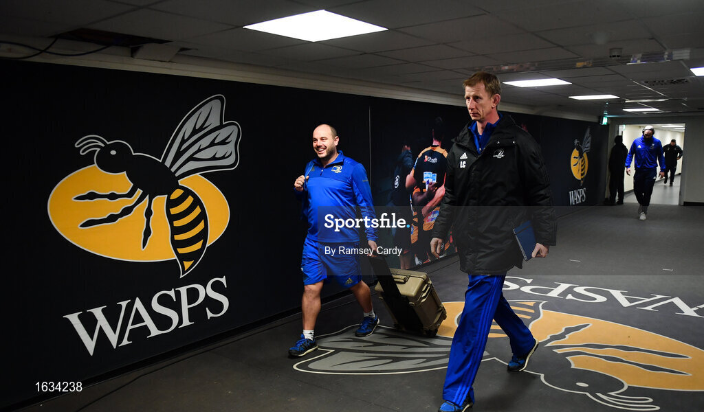 20 January 2019; Leinster head coach Leo Cullen, right, and Leinster kicking coach and head analyst Emmet Farrell arrives ahead of the Heineken Champions Cup Pool 1 Round 6 match between Wasps and Leinster at the Ricoh Arena in Coventry, England. Photo by Ramsey Cardy/Sportsfile