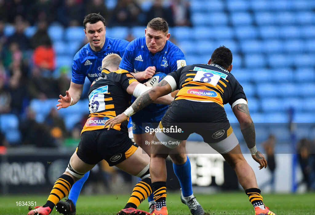 20 January 2019; Tadhg Furlong of Leinster is tackled by Ben Morris, left, and Jake Cooper-Woolley of Wasps during the Heineken Champions Cup Pool 1 Round 6 match between Wasps and Leinster at the Ricoh Arena in Coventry, England. Photo by Ramsey Cardy/Sportsfile