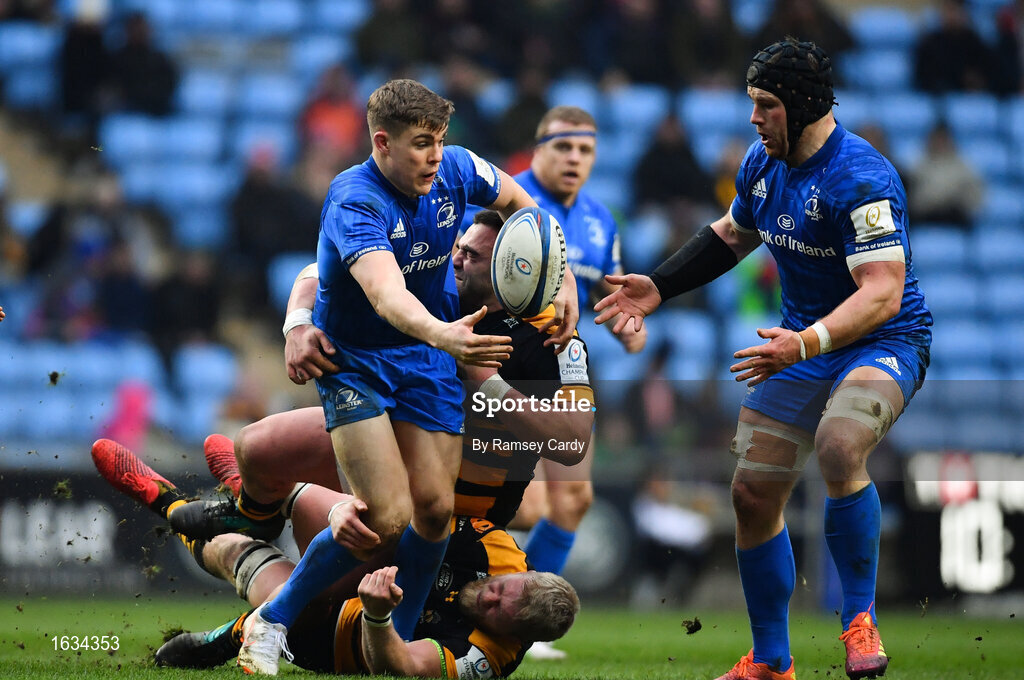 20 January 2019; Garry Ringrose offloads to Leinster teammate Seán O'Brien during the Heineken Champions Cup Pool 1 Round 6 match between Wasps and Leinster at the Ricoh Arena in Coventry, England. Photo by Ramsey Cardy/Sportsfile
