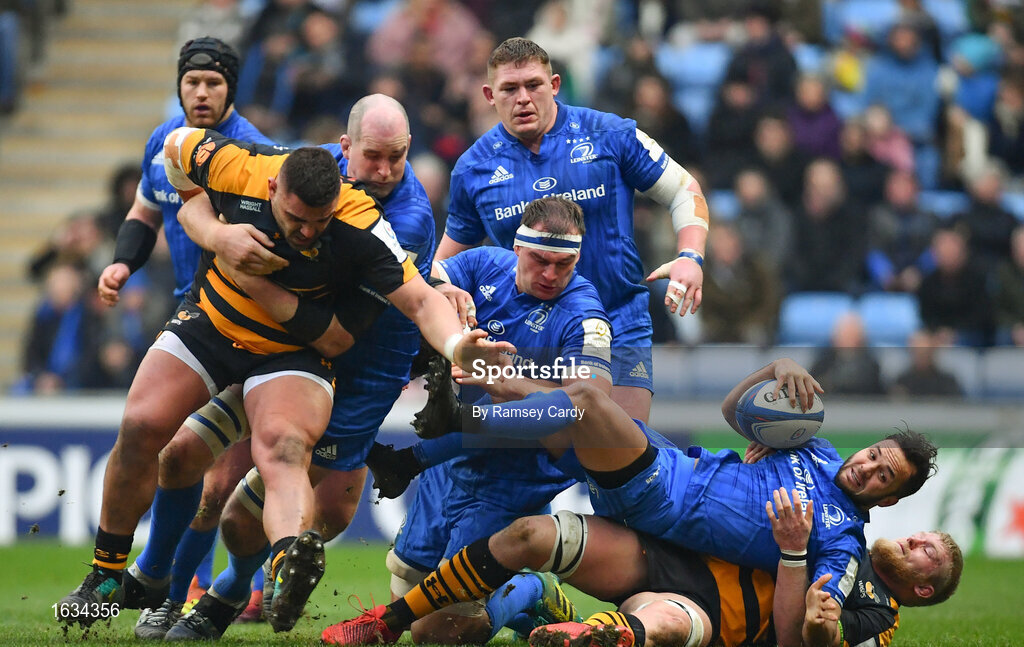 20 January 2019; Jamison Gibson-Park of Leinster is tackled by Tom Cruse of Wasps during the Heineken Champions Cup Pool 1 Round 6 match between Wasps and Leinster at the Ricoh Arena in Coventry, England. Photo by Ramsey Cardy/Sportsfile