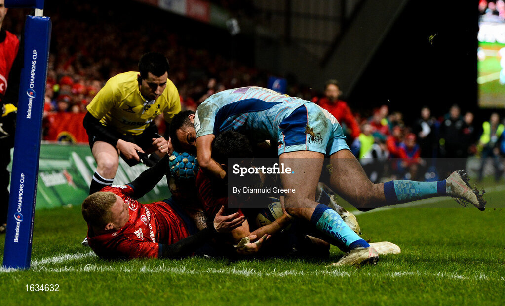 19 January 2019; Conor Murray of Munster, supported by team-mate Keith Earls, is tackled by Tom O'Flaherty and Jack Nowell of Exeter Chiefs during the Heineken Champions Cup Pool 2 Round 6 match between Munster and Exeter Chiefs at Thomond Park in Limerick. Photo by Diarmuid Greene/Sportsfile