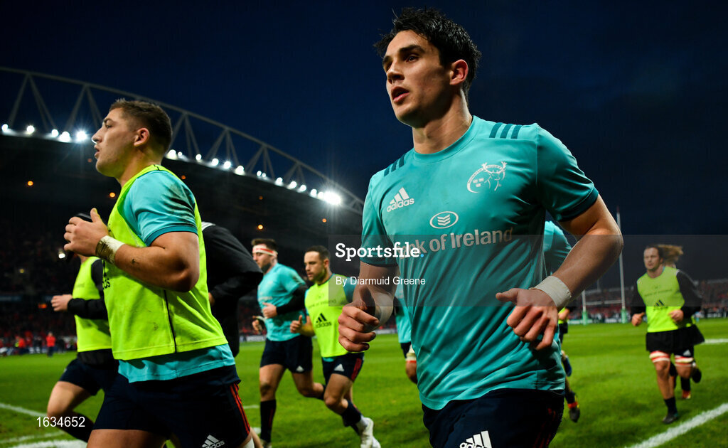 19 January 2019; Joey Carbery and Dan Goggin of Munster prior to the Heineken Champions Cup Pool 2 Round 6 match between Munster and Exeter Chiefs at Thomond Park in Limerick. Photo by Diarmuid Greene/Sportsfile