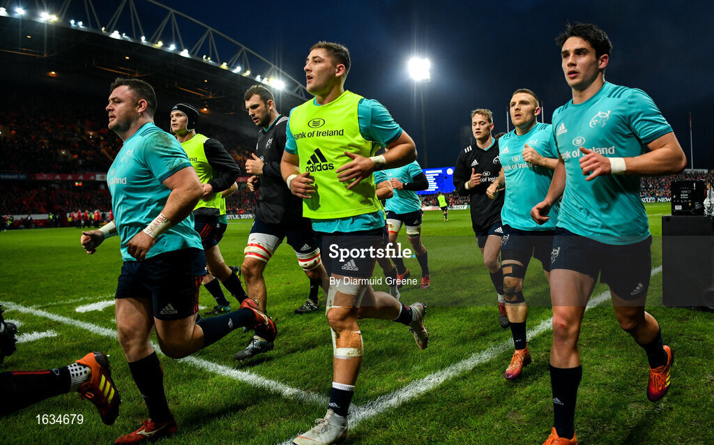 19 January 2019; Dave Kilcoyne, Dan Goggin, and Joey Carbery of Munster prior to the Heineken Champions Cup Pool 2 Round 6 match between Munster and Exeter Chiefs at Thomond Park in Limerick. Photo by Diarmuid Greene/Sportsfile