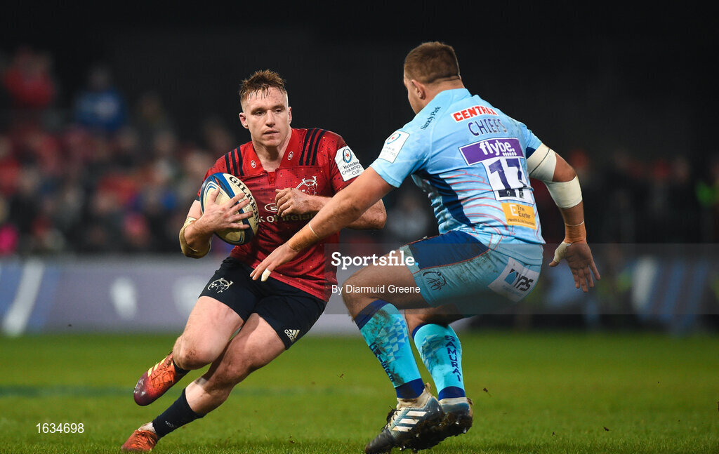 19 January 2019; Rory Scannell of Munster is tackled by Ben Moon of Exeter Chiefs during the Heineken Champions Cup Pool 2 Round 6 match between Munster and Exeter Chiefs at Thomond Park in Limerick. Photo by Diarmuid Greene/Sportsfile