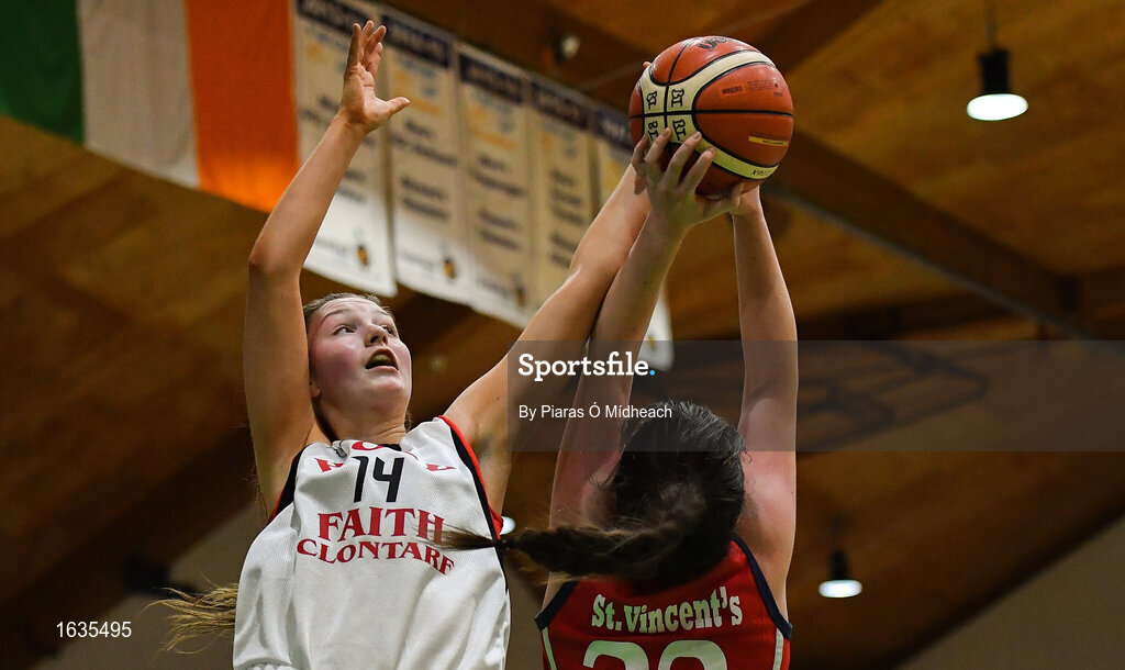 23 January 2019; Maeve O’Seaghdha of Holy Faith Clontarf in action against Mollie Blount of St Vincent’s SS, Cork, during the Subway All-Ireland Schools Cup U19 A Girls Final match between Holy Faith Clontarf and St Vincent's SS, Cork, at the National Basketball Arena in Tallaght, Dublin. Photo by Piaras Ó Mídheach/Sportsfile