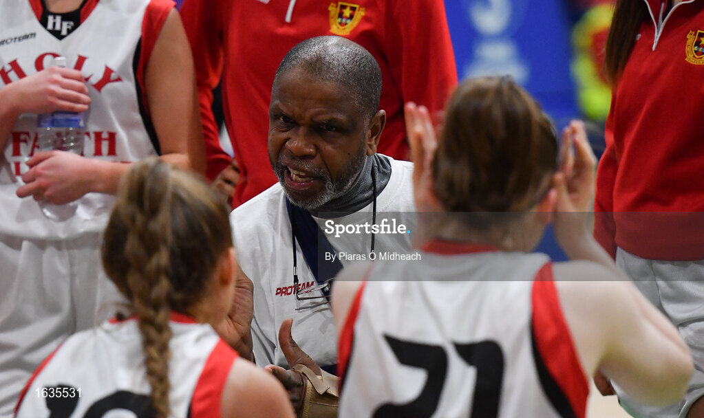 23 January 2019; Holy Faith Clontarf coach Jerome Westbrooks during a time-out in the Subway All-Ireland Schools Cup U19 A Girls Final match between Holy Faith Clontarf and St Vincent's SS, Cork, at the National Basketball Arena in Tallaght, Dublin. Photo by Piaras Ó Mídheach/Sportsfile