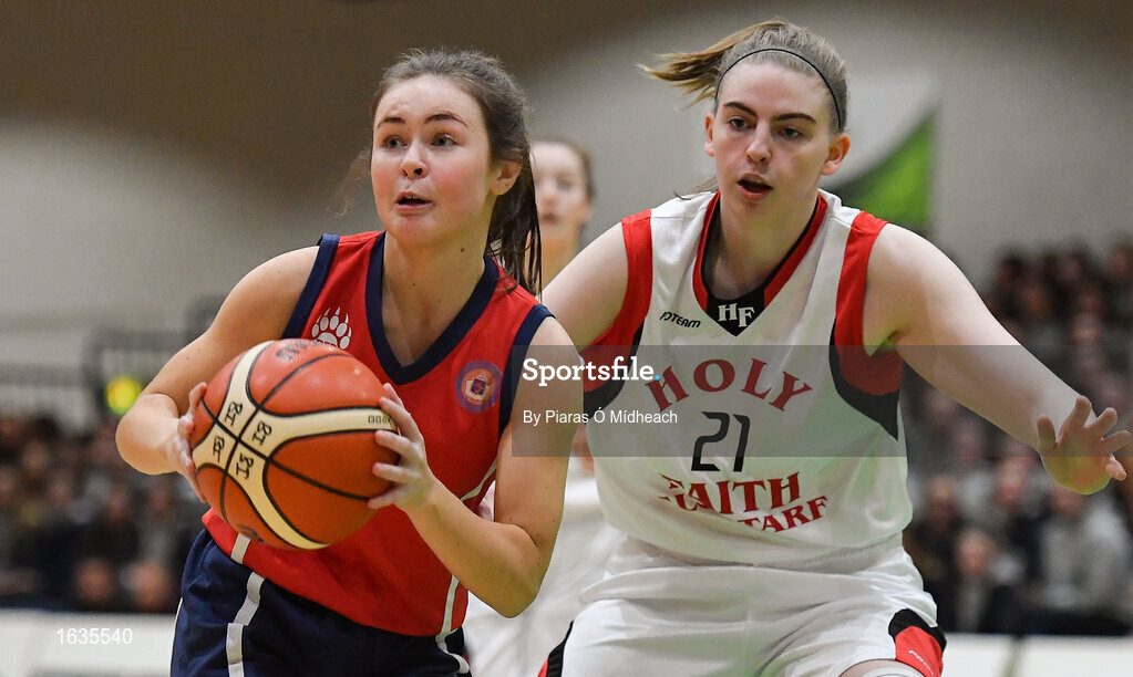 23 January 2019; Eve Hannigan of St Vincent’s SS, Cork, in action against Bronagh Power Cassidy of Holy Faith Clontarf during the Subway All-Ireland Schools Cup U19 A Girls Final match between Holy Faith Clontarf and St Vincent's SS, Cork, at the National Basketball Arena in Tallaght, Dublin. Photo by Piaras Ó Mídheach/Sportsfile