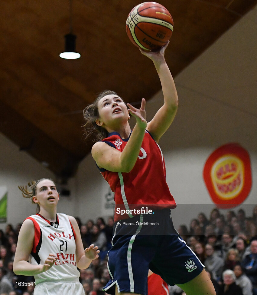 23 January 2019; Eve Hannigan of St Vincent’s SS, Cork, shoots as Bronagh Power Cassidy of Holy Faith Clontarf looks on during the Subway All-Ireland Schools Cup U19 A Girls Final match between Holy Faith Clontarf and St Vincent's SS, Cork, at the National Basketball Arena in Tallaght, Dublin. Photo by Piaras Ó Mídheach/Sportsfile