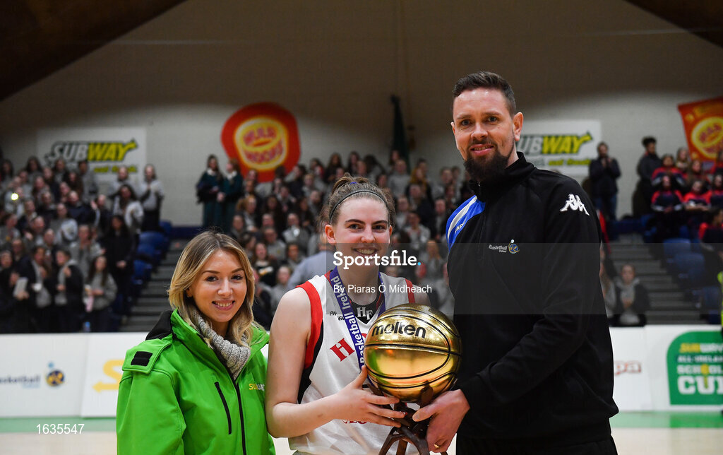 23 January 2019; Bronagh Power Cassidy of Holy Faith Clontarf is presented with her MVP award by Kirby Axon of Subway and Jason Killeen of Basketball Ireland after the Subway All-Ireland Schools Cup U19 A Girls Final match between Holy Faith Clontarf and St Vincent's SS, Cork, at the National Basketball Arena in Tallaght, Dublin. Photo by Piaras Ó Mídheach/Sportsfile