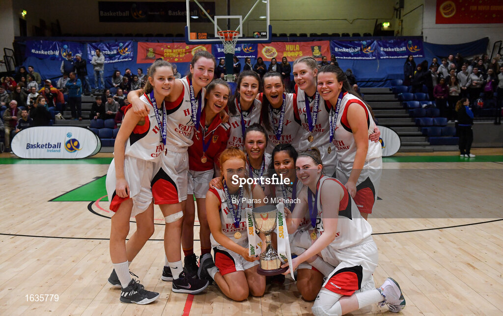 23 January 2019; Holy Faith Clontarf players celebrate after the Subway All-Ireland Schools Cup U19 A Girls Final match between Holy Faith Clontarf and St Vincent's SS, Cork, at the National Basketball Arena in Tallaght, Dublin. Photo by Piaras Ó Mídheach/Sportsfile