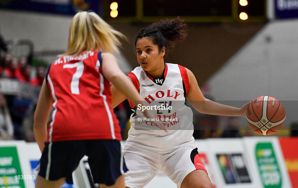 23 January 2019; Elizabeth Black of Holy Faith Clontarf in action against Orla Murphy of St Vincent’s SS, Cork, during the Subway All-Ireland Schools Cup U19 A Girls Final match between Holy Faith Clontarf and St Vincent's SS, Cork, at the National Basketball Arena in Tallaght, Dublin. Photo by Piaras Ó Mídheach/Sportsfile
