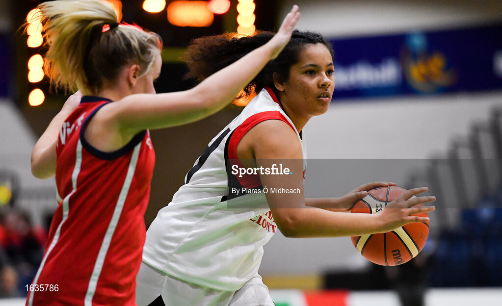 23 January 2019; Elizabeth Black of Holy Faith Clontarf in action against Orla Murphy of St Vincent’s SS, Cork, during the Subway All-Ireland Schools Cup U19 A Girls Final match between Holy Faith Clontarf and St Vincent's SS, Cork, at the National Basketball Arena in Tallaght, Dublin. Photo by Piaras Ó Mídheach/Sportsfile