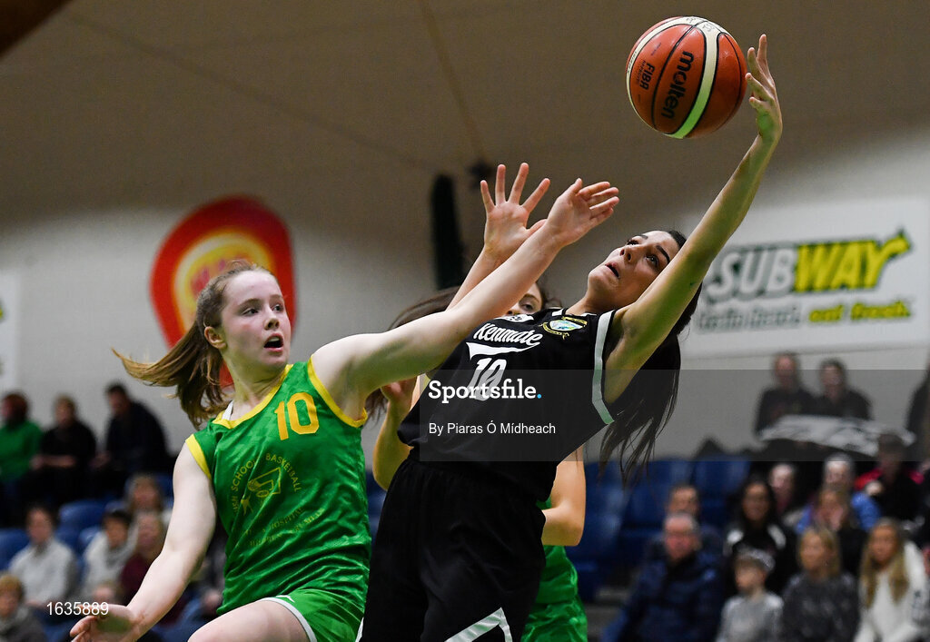 23 January 2019; Tania Salvado of Pobailscoil Inbhear Sceine Kenmare in action against Kara McCleane of Coláiste Einde during the Subway All-Ireland Schools Cup U16 A Girls Final match between Coláiste Einde and Pobailscoil Inbhear Sceine Kenmare at the National Basketball Arena in Tallaght, Dublin. Photo by Piaras Ó Mídheach/Sportsfile