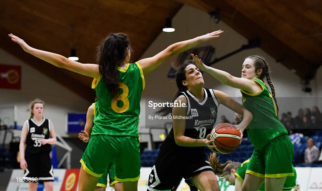 23 January 2019; Tania Salvado of Pobailscoil Inbhear Sceine Kenmare in action against Ellen Power, left, and Grace Webb of Coláiste Einde during the Subway All-Ireland Schools Cup U16 A Girls Final match between Coláiste Einde and Pobailscoil Inbhear Sceine Kenmare at the National Basketball Arena in Tallaght, Dublin. Photo by Piaras Ó Mídheach/Sportsfile