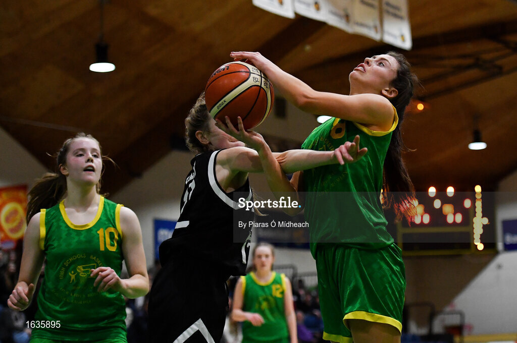 23 January 2019; Ellen Power of Coláiste Einde in action against Clionadh Daly of Pobailscoil Inbhear Sceine Kenmare during the Subway All-Ireland Schools Cup U16 A Girls Final match between Coláiste Einde and Pobailscoil Inbhear Sceine Kenmare at the National Basketball Arena in Tallaght, Dublin. Photo by Piaras Ó Mídheach/Sportsfile