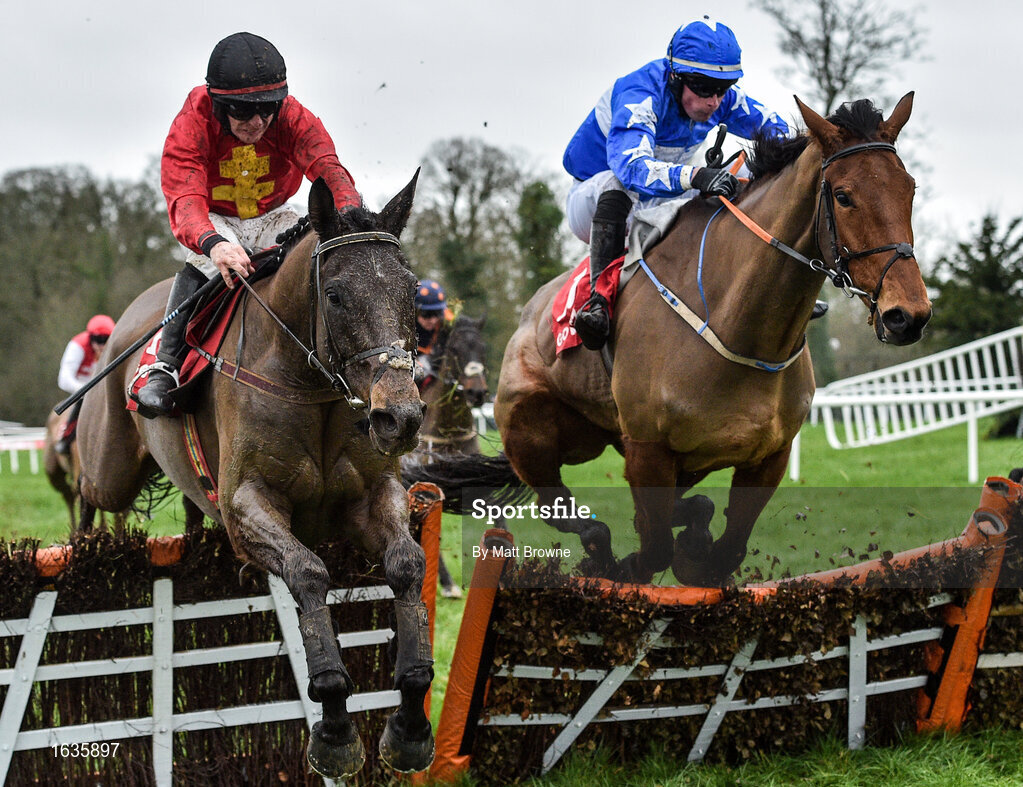 24 January 2019; Spare Brakes, left, with Philip Enright up, jumps the last alongside eventual fifth place finisher Breesy Mountain, with Danny Hand up, on their way to winning the Langton House Hotel Handicap Hurdle during Gowran Park Racing at Gowran Park Racecourse in Kilkenny. Photo by Matt Browne/Sportsfile