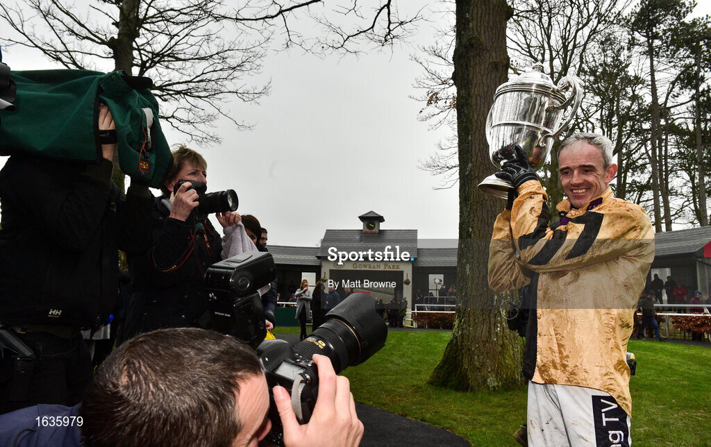 24 January 2019; Ruby Walsh with the Thyestes Handicap after winning the Goffs Thyestes Handicap Steeplechase with Invitation Only during Gowran Park Racing at Gowran Park Racecourse in Kilkenny. Photo by Matt Browne/Sportsfile