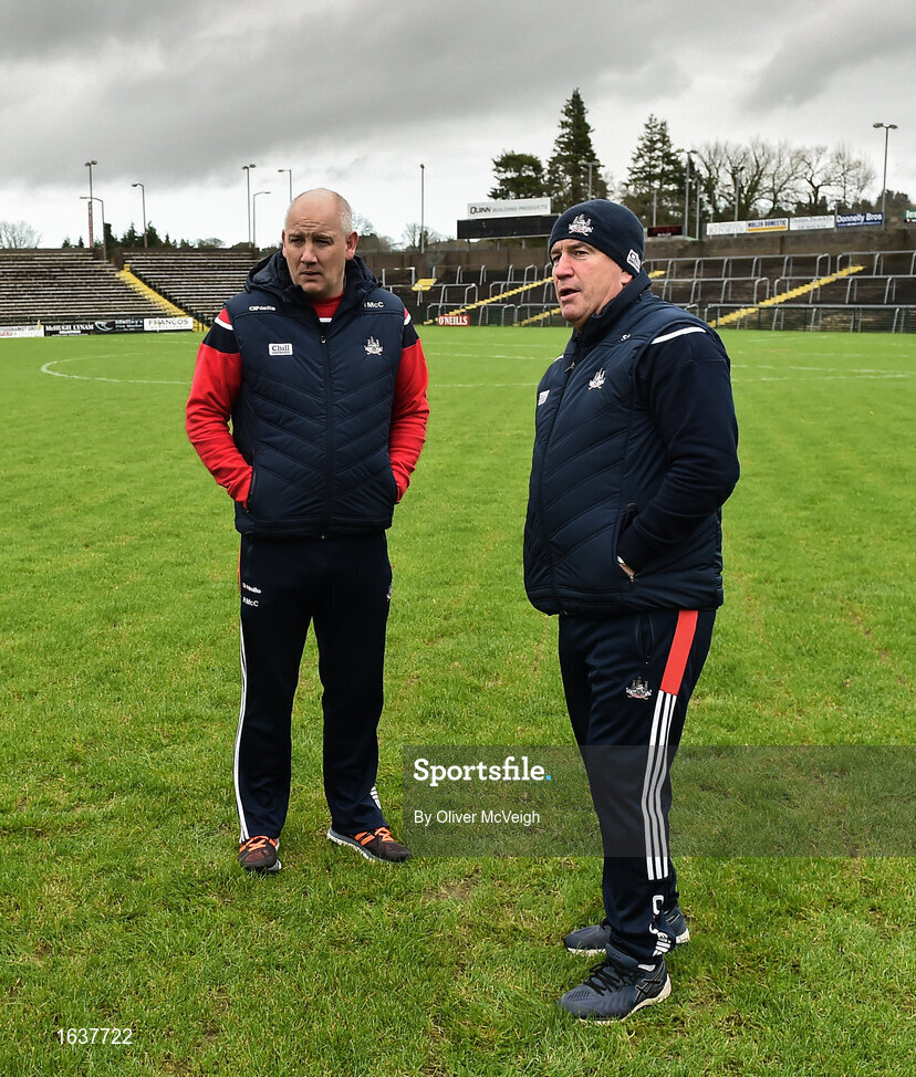 27 January 2019; Cork manager Ronan McCarthy, left, and selector Sean Hayes before the Allianz Football League Division 2 Round 1 match between Fermanagh and Cork at Brewster Park in Enniskillen, Fermanagh. Photo by Oliver McVeigh/Sportsfile