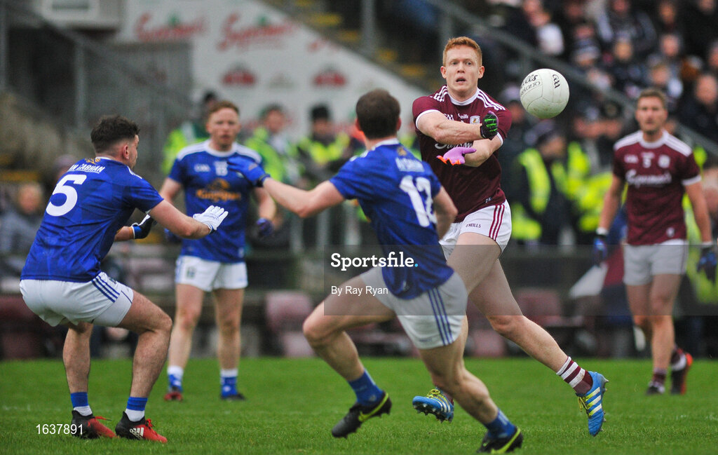 27 January 2019; Kieran Duggan of Galway in action against Niall Murray, left, and Martin Reilly of Cavan during the Allianz Football League Division 1 Round 1 match between Galway and Cavan at Pearse Stadium in Galway. Photo by Ray Ryan/Sportsfile