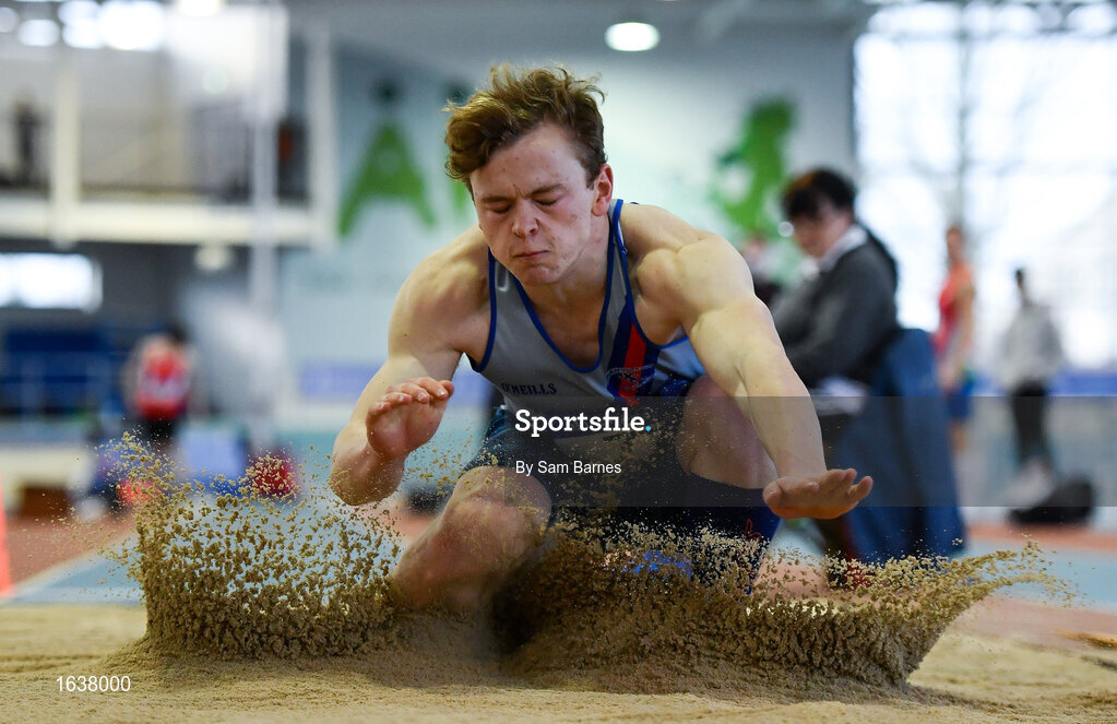27 January 2019; David Dagg of Dundrum South Dublin AC, Co. Dublin, competing in the U23 Men Long Jump event during the Irish Life Health Junior and U23 Indoors at AIT International Arena in Athlone, Co. Westmeath. Photo by Sam Barnes/Sportsfile