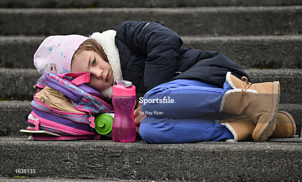27 January 2019; Teaghan O'Shaughnessy, age 7, from Corrandulla, has a rest during the Allianz Football League Division 1 Round 1 match between Galway and Cavan at Pearse Stadium in Galway. Photo by Ray Ryan/Sportsfile