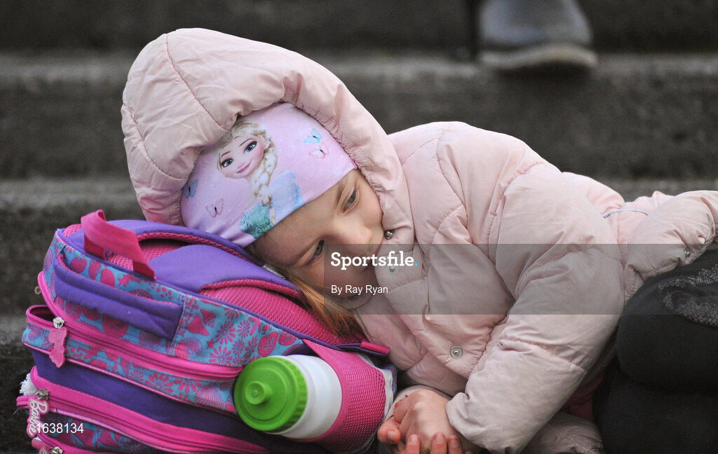 27 January 2019; Kayleigh O'Shaughnessy, age 5, from Corrandulla, has a rest during the Allianz Football League Division 1 Round 1 match between Galway and Cavan at Pearse Stadium in Galway. Photo by Ray Ryan/Sportsfile