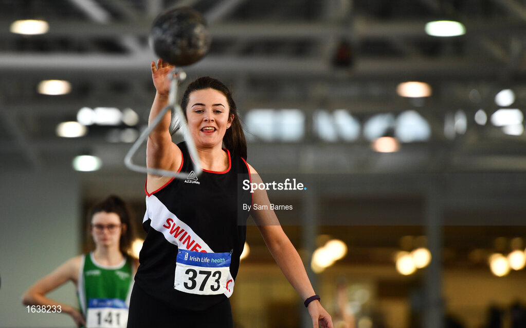 27 January 2019; Michaela Walsh of Swinford AC, Co. Mayo, competing in the U23 Women 28lbs Distance event during the Irish Life Health Junior and U23 Indoors at AIT International Arena in Athlone, Co. Westmeath. Photo by Sam Barnes/Sportsfile