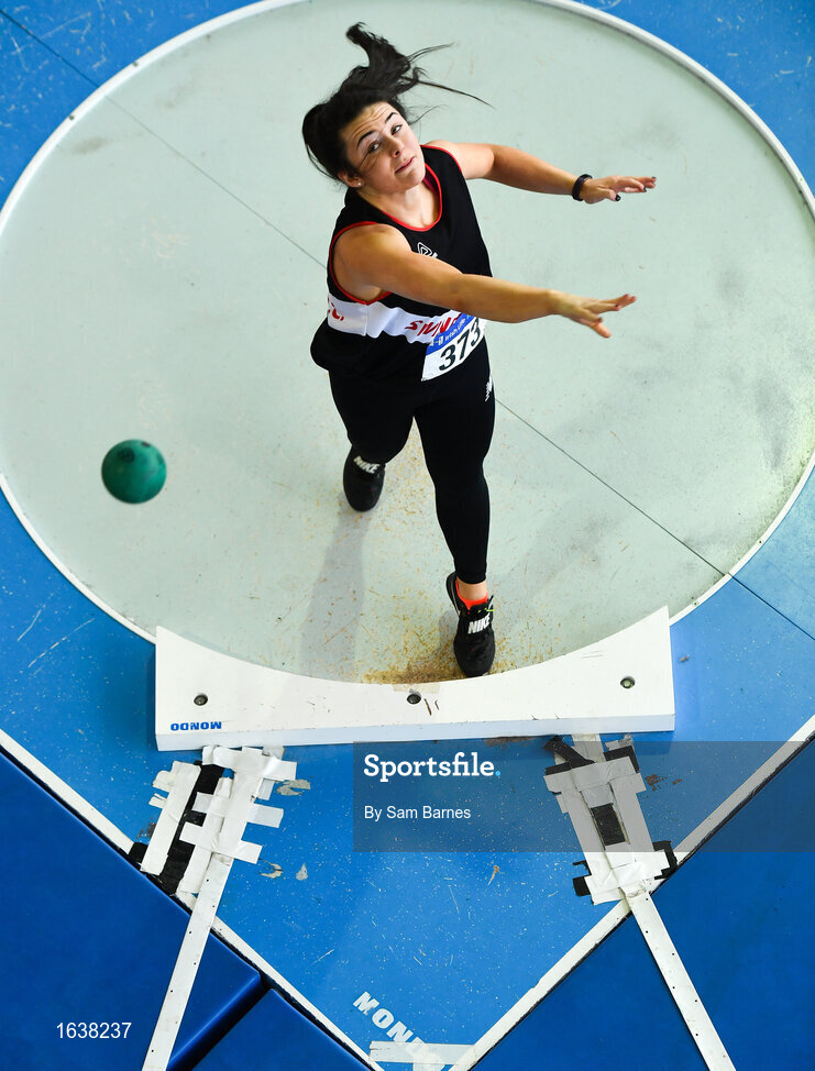 27 January 2019; Michaela Walsh of Swinford AC, Co. Mayo, competing in the U23 Women Shot Put event during the Irish Life Health Junior and U23 Indoors at AIT International Arena in Athlone, Co. Westmeath. Photo by Sam Barnes/Sportsfile