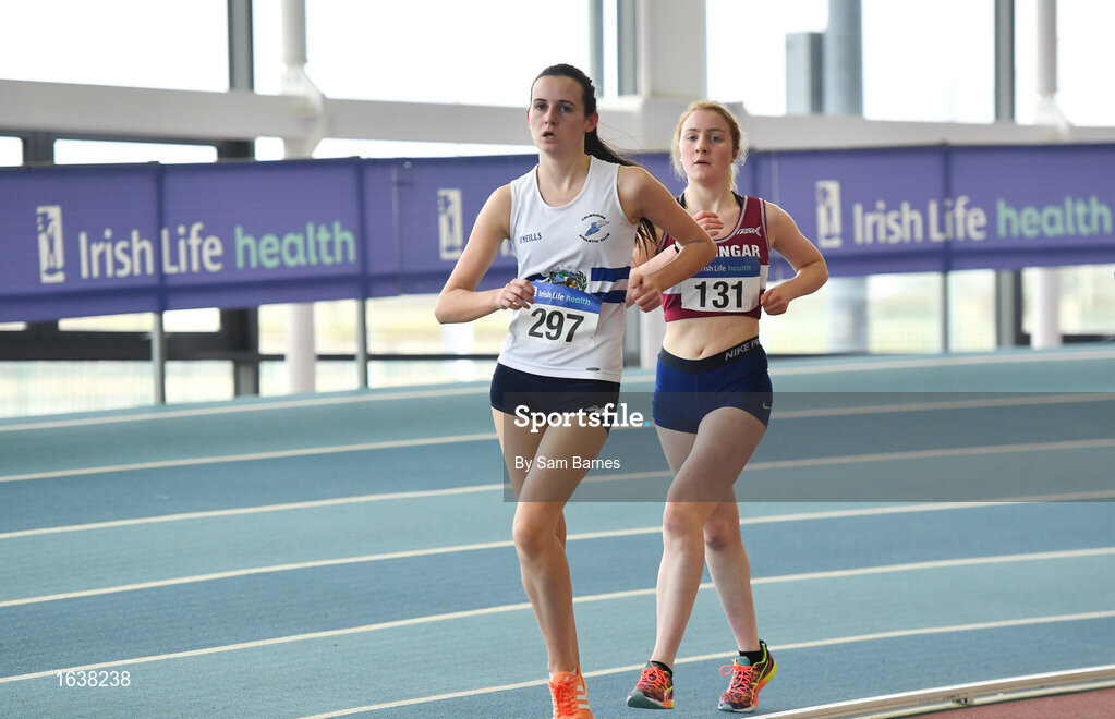 27 January 2019; Niamh O'Connor of Celbridge AC, Co. Kildare, left, on her way to winning the Junior Women 3km Walk event, ahead of Sarah Glennon of Mullingar Harriers AC, Co. Westmeath, during the Irish Life Health Junior and U23 Indoors at AIT International Arena in Athlone, Co. Westmeath. Photo by Sam Barnes/Sportsfile