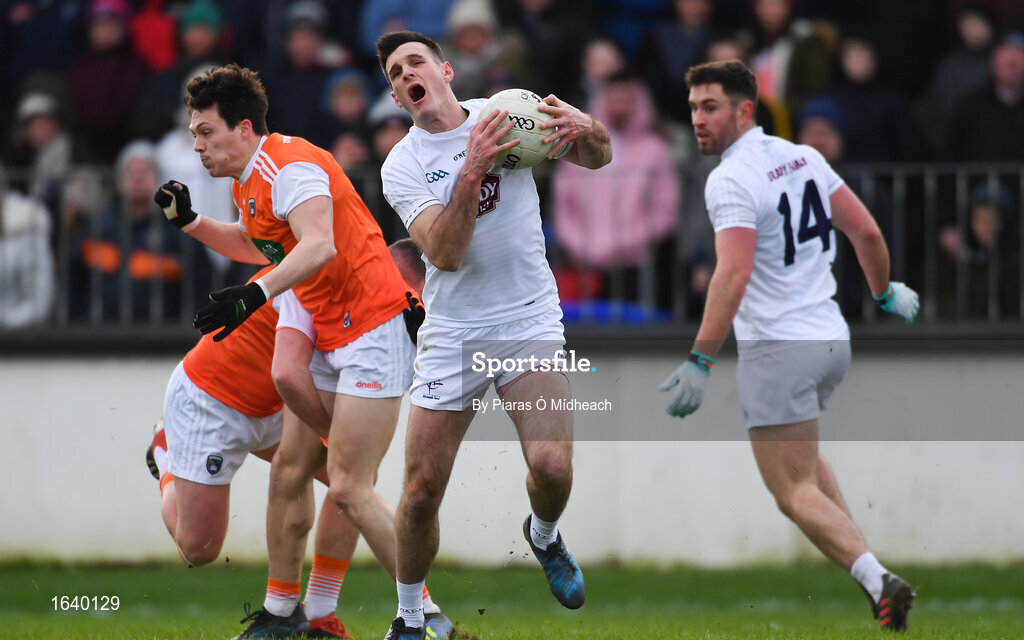 27 January 2019; Eoin Doyle of Kildare gets past Ryan McShane, behind, and James Morgan of Armagh as team-mate Ben McCormack looks on during the Allianz Football League Division 2 Round 1 match between Kildare and Armagh at St Conleth's Park in Newbridge, Kildare. Photo by Piaras Ó Mídheach/Sportsfile