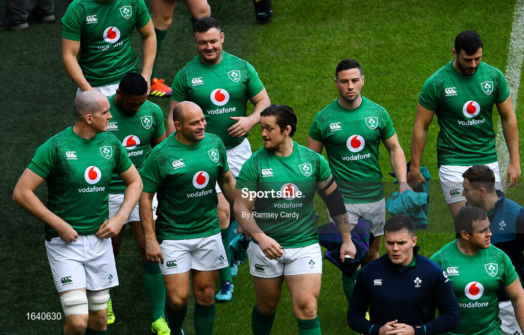 1 February 2019; The Ireland squad, including captain Rory Best, walk out for the Ireland Rugby captain's run at the Aviva Stadium in Dublin. Photo by Ramsey Cardy/Sportsfile