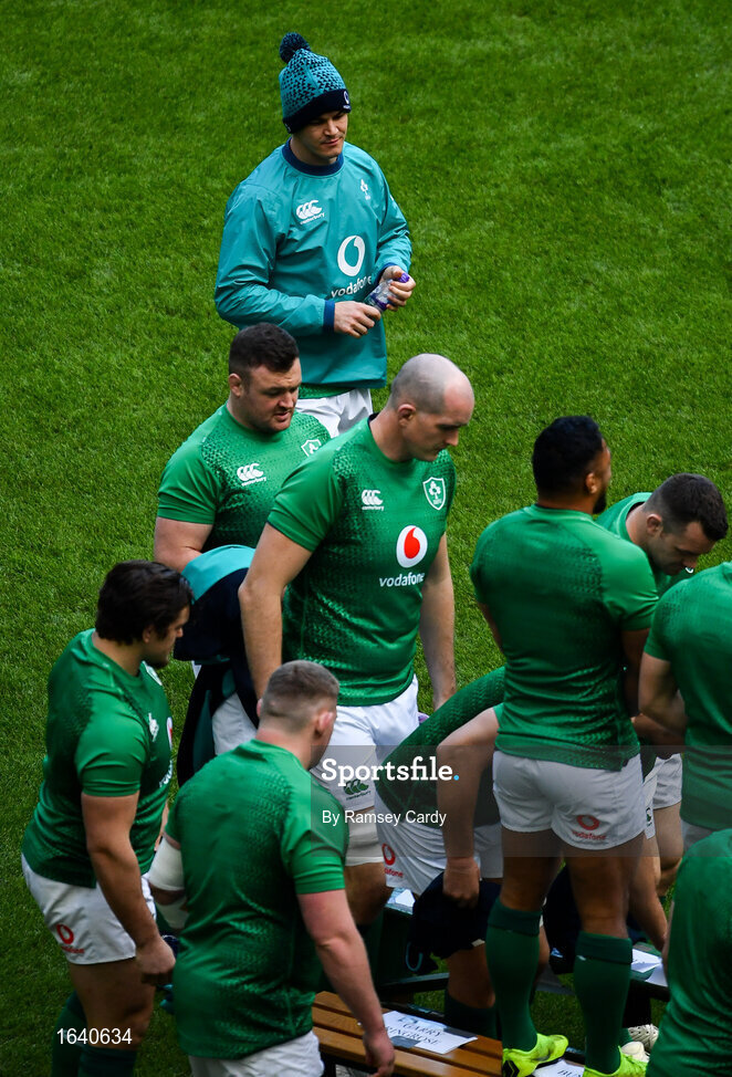 1 February 2019; Jonathan Sexton joins his teammates for the team photograph during the Ireland Rugby captain's run at the Aviva Stadium in Dublin. Photo by Ramsey Cardy/Sportsfile
