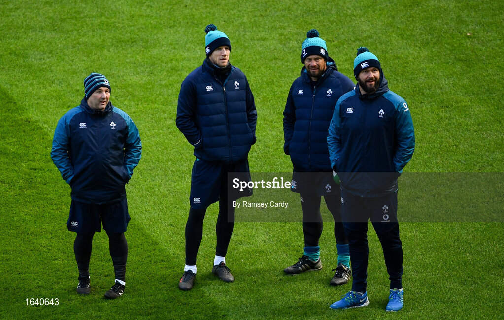 1 February 2019; Members of the Ireland coaching team, from left, kicking coach Richie Murphy, forwards coach Simon Easterby, scrum coach Greg Feek and defence coach Andy Farrell during the Ireland Rugby captain's run at the Aviva Stadium in Dublin. Photo by Ramsey Cardy/Sportsfile