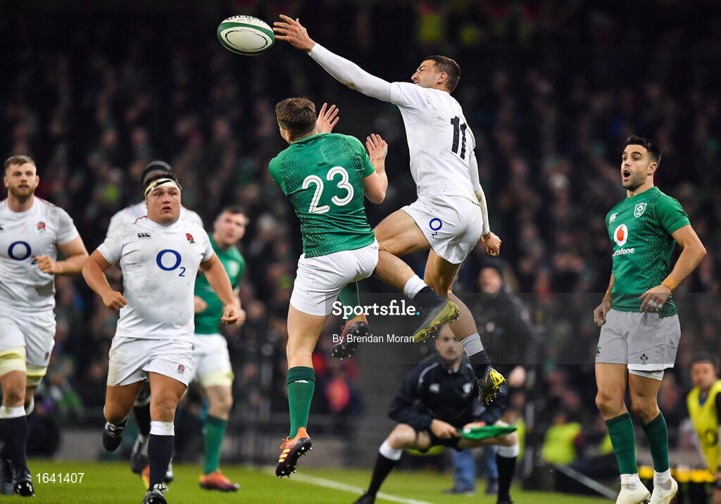 2 February 2019; Jonny May of England keeps the ball in-play ahead of Jordan Larmour of Ireland during the Guinness Six Nations Rugby Championship match between Ireland and England in the Aviva Stadium in Dublin. Photo by Brendan Moran/Sportsfile