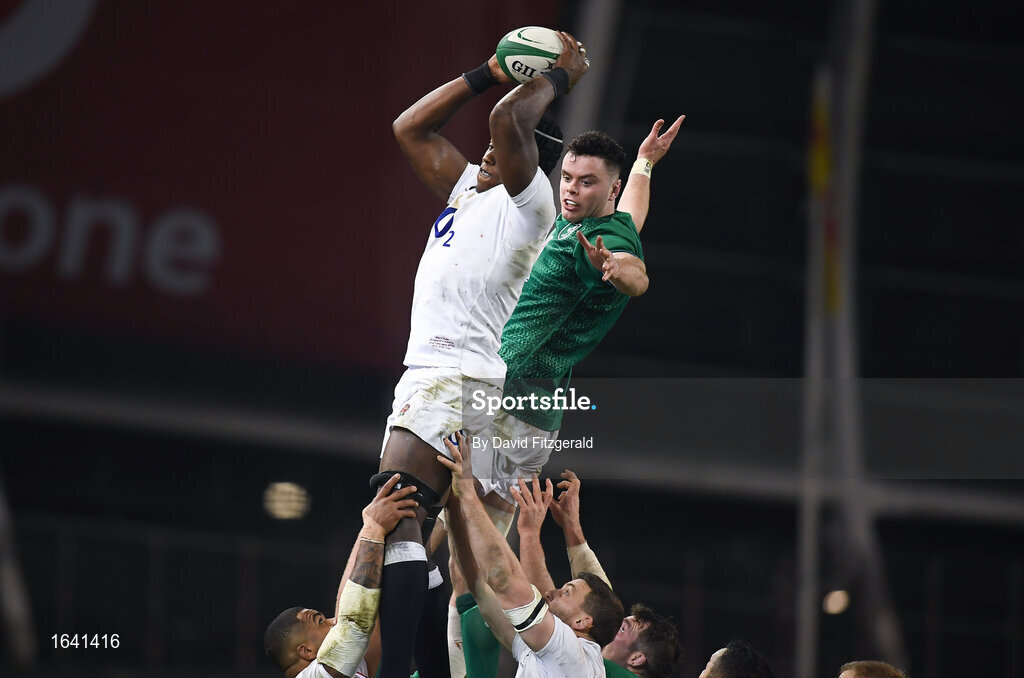2 February 2019; Maro Itoje of England wins possession in a lineout ahead of James Ryan of Ireland during the Guinness Six Nations Rugby Championship match between Ireland and England in the Aviva Stadium in Dublin. Photo by David Fitzgerald/Sportsfile