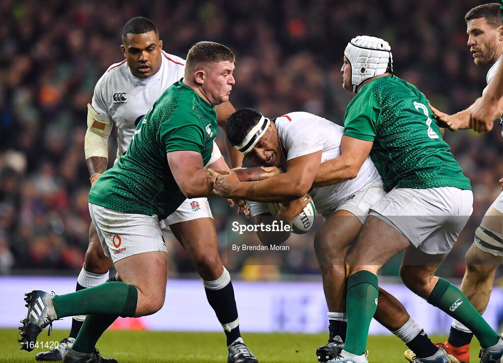 2 February 2019; Mako Vunipola of England Rory Best, left, and Tadhg Furlong of Ireland during the Guinness Six Nations Rugby Championship match between Ireland and England in the Aviva Stadium in Dublin. Photo by Brendan Moran/Sportsfile