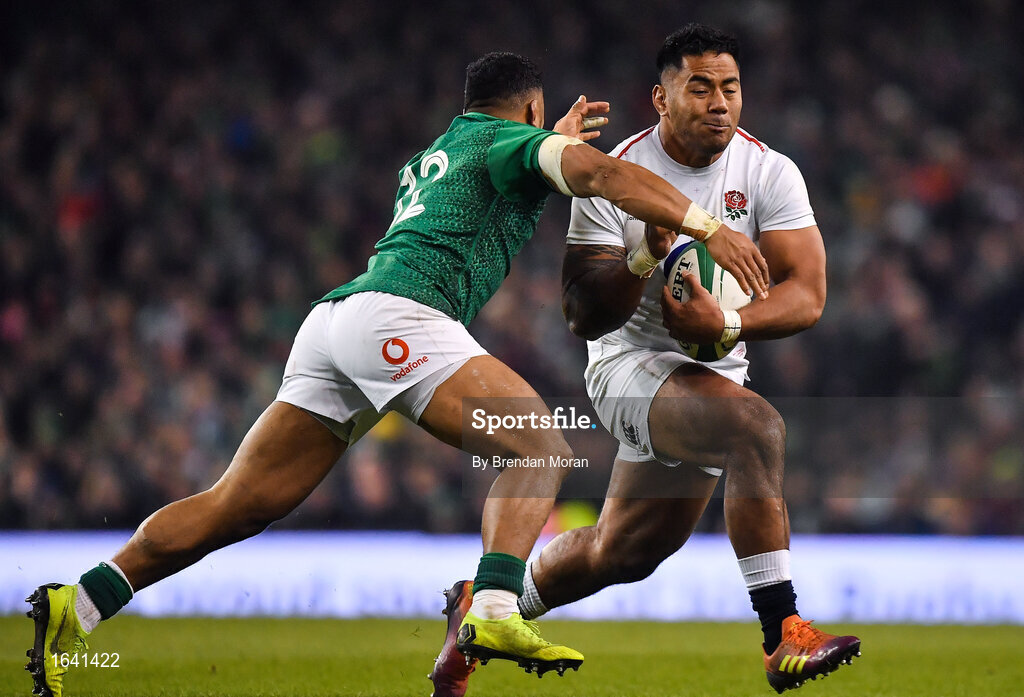 2 February 2019; Manu Tuilagi of England is tackled by Bundee Aki of Ireland during the Guinness Six Nations Rugby Championship match between Ireland and England in the Aviva Stadium in Dublin. Photo by Brendan Moran/Sportsfile