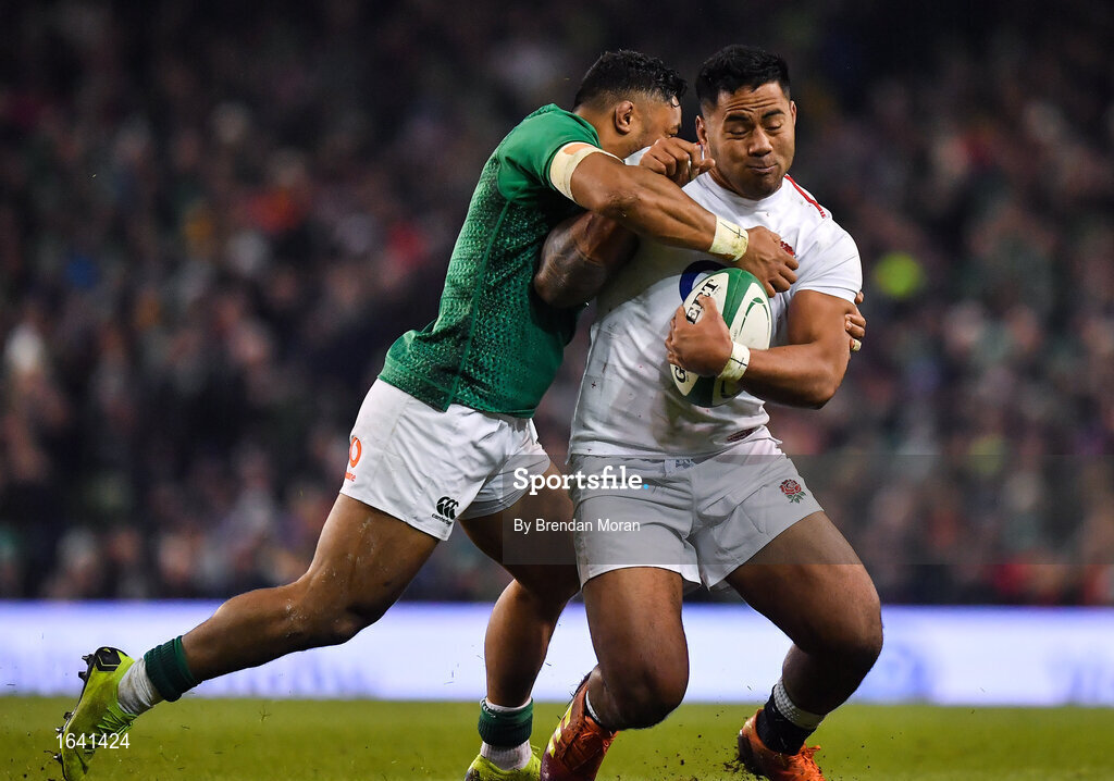 2 February 2019; Manu Tuilagi of England is tackled by Bundee Aki of Ireland during the Guinness Six Nations Rugby Championship match between Ireland and England in the Aviva Stadium in Dublin. Photo by Brendan Moran/Sportsfile