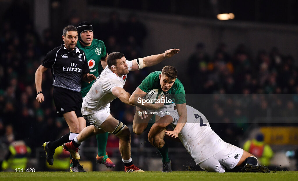 2 February 2019; Garry Ringrose of Ireland is tackled by Mark Wilson, left, and Jamie George of England during the Guinness Six Nations Rugby Championship match between Ireland and England in the Aviva Stadium in Dublin. Photo by Ramsey Cardy/Sportsfile