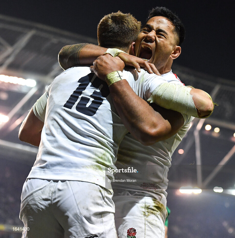 2 February 2019; Henry Slade of England celebrates after scoring his side's third try with teammate Manu Tuilagi during the Guinness Six Nations Rugby Championship match between Ireland and England in the Aviva Stadium in Dublin. Photo by Brendan Moran/Sportsfile